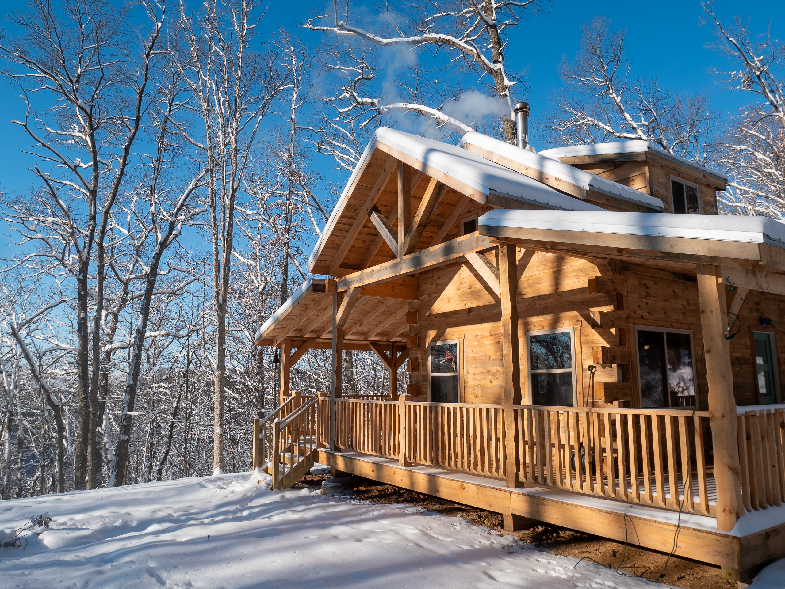 Driftless Creek offers light-filled, clean-lines, full-amenity modern cabins, each private from the other, nestled in the woods 15 minutes from Viroqua. Down a scenic dirt road, and up a steep private driveway, you will enter our 75 acres of ridgetop forest between two spring-fed streams. We offer 2 miles of trails on property for hiking, mountain-biking, or snowshoeing. Adjacent state natural areas on 3 sides enhance the remote wilderness feeling. The quiet is restorative and the dark nights are perfect for star-gazing. This really might be the place where you pick up a book or a well-maintained ukulele or guitar we provide, or let the hours go by in a hammock on the screened porch.